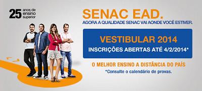 O vestibular EaD Senac SP 2014 está com as inscrições abertas até o dia 4 de fevereiro de 2014 no endereço: www.sp.senac.br/jsp/login/Login?window=ead&auth=1&destino=http://www.sp.senac.br/jsp/login/default.jsp?template=2002.dwt&testeira=2050&id=20101&sel_unit=SP%20-%20CAMPUS%20SANTO%20AMARO&desc=vest. A taxa de inscrição é de R$ 20,00 pela prova de redação agendada, Enem ou avaliação do histórico escolar.